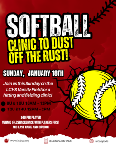 Come out to the LCHS Varsity Softball field on 1/18 for a hitting and fielding tune-up before the season starts. The clinic is open to all players in the 8U through 14U divisions.
