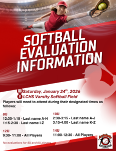 This Saturday, all players in the 8U through 14U divisions are to attend evaluations at their designated times below.